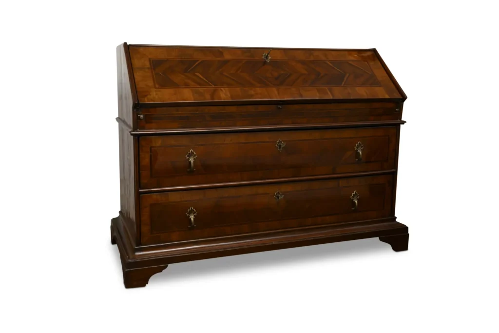 Antica ribalta del XVIII° secolo lastronata in noce con intarsi in acero e lavorazione a spina di pesce.
